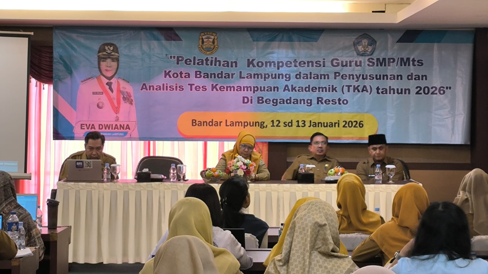 TEGAKLURUS.CO – Pelaksana Tugas (Plt) Kepala Dinas Pendidikan dan Kebudayaan Kota Bandar Lampung, Hj. Eka Afriana, S.Pd, membuka pelatihan Penyusunan dan Analisis Tes Kemampuan Akademik (TKA), di Begadang Resto Convention Hall, Teluk Betung Bandar Lampung, Senin, 12 Januari 2026.
